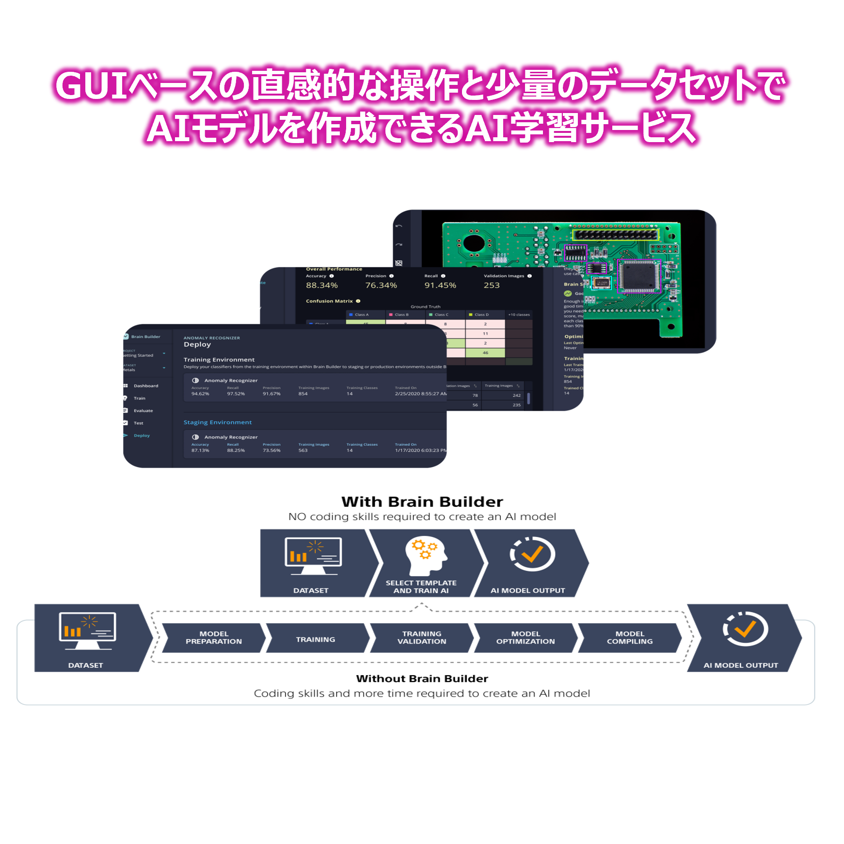 またAIモデルの学習にGPUは必須ではないため、ローカル環境で高コストなハードウェアを利用せずともAIモデルの学習が可能です。スコアスキルがなくても、ラベル付けや学習、エッジセンシングデバイスで使用可能なAIモデルの作成が可能です。
