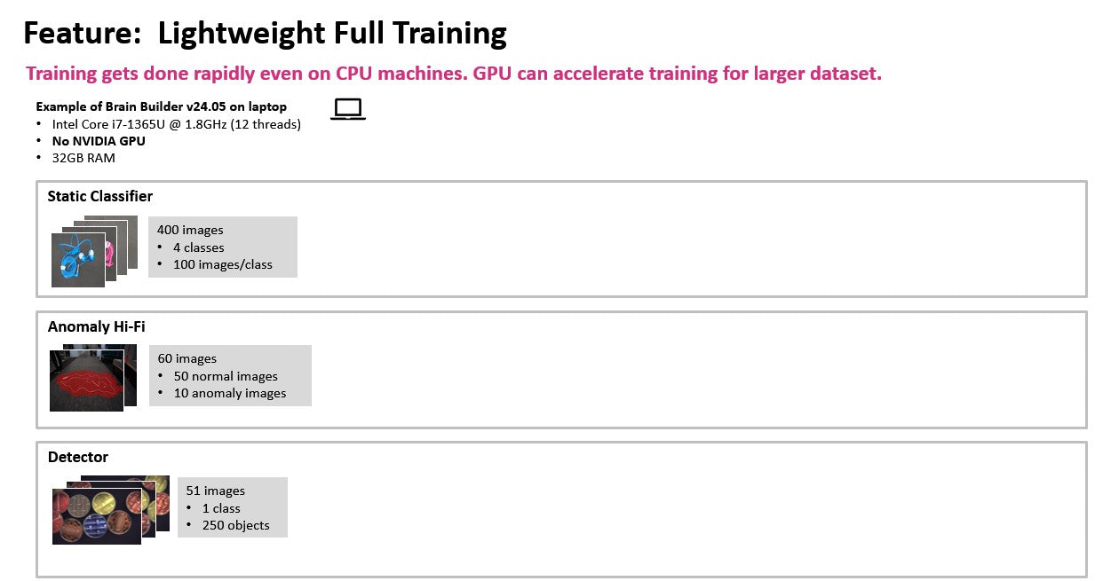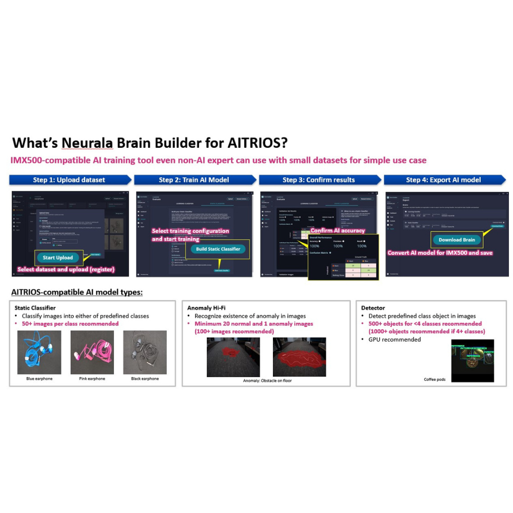 Brain Builderは、ディープラーニングのAIモデルを簡単に作成できるAI学習ツールです。 IMX500またはIMX501を搭載するエッジセンシングデバイスでの高速なAI処理を実現するためのAI学習ツールで、お客様の環境で収集しました画像を用いて、迅速にAIモデルをトレーニングすることが可能です。AIモデルを最適化するツールも付属されています。